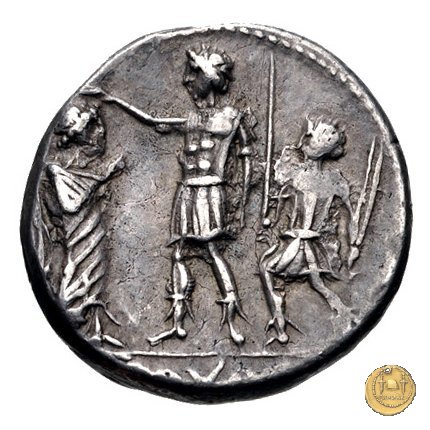 Al centro una figura in abito militare con corazza e parazonium; protende la mano destra sul capo di un personaggio togato (a sinistra) che gesticola con la mano destra. A destra un littore: tiene una verga con la mano destra, due verghe con la sinistra.