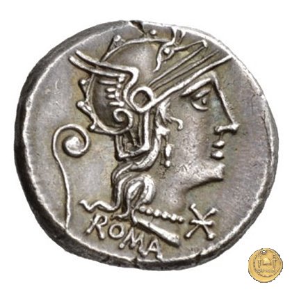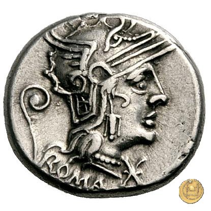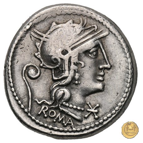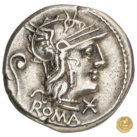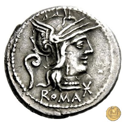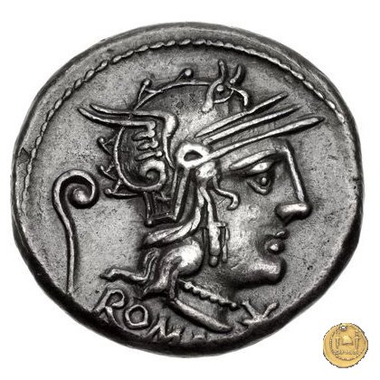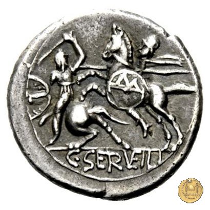 Testa di Roma a destra, con elmo attico alato decorato con una stella sul paranuca. Dietro un lituus; davanti: sedici assi Cavaliere alla carica verso sinistra (con uno scudo rotondo decorato con lettera M) in atto di colpire con la lancia un altro cavaliere che cerca di difendersi con la spada.