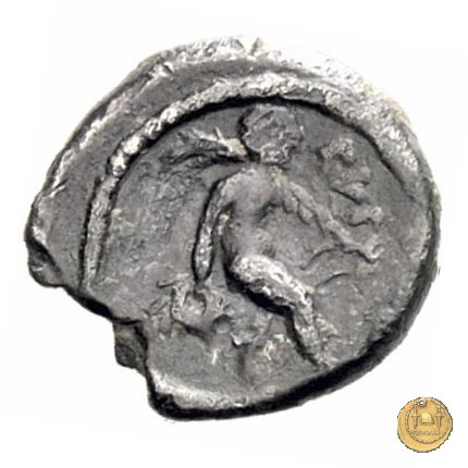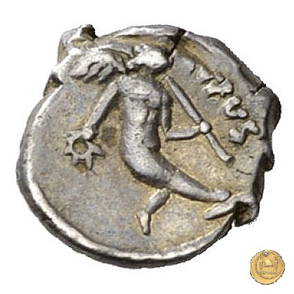 Cupido in cammino verso destra; regge con la mano sinistra un ramo di palma sulla spalla e tiene con la destra una corona.
