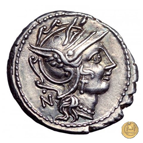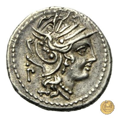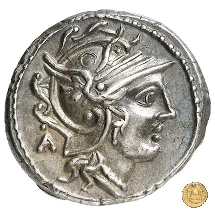 Testa di Roma a destra, con elmo attico alato. Dietro una lettera di controllo.
