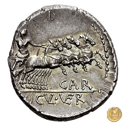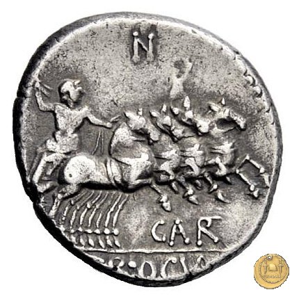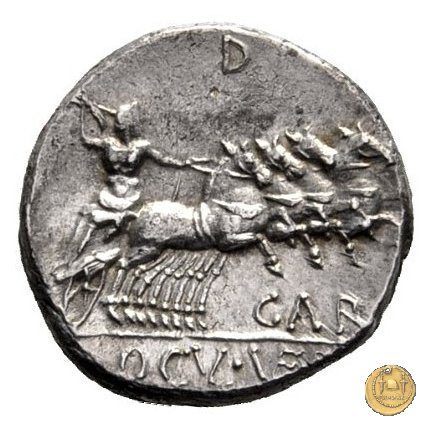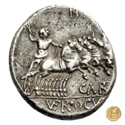 Giove su quadriga verso destra; tiene le redini con la mano sinistra e sta per scagliare il fulmine con la destra. In alto una lettera di controllo.