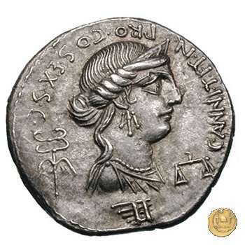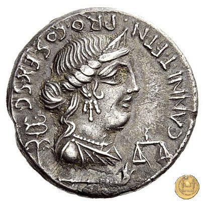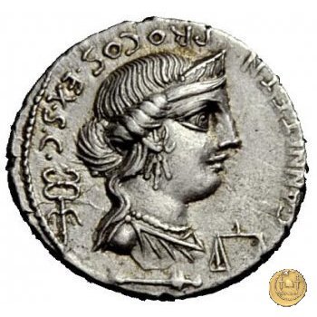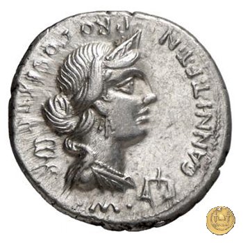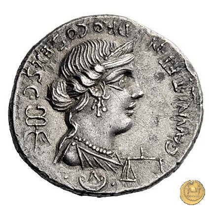 Busto femminile a destra, drappeggiato e con diadema. Davanti una bilancia; dietro un caduceo alato. La Vittoria su quadriga verso destra; tiene le redini con la mano sinistra, un ramo di palma con la destra. In alto: Q