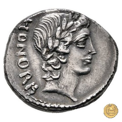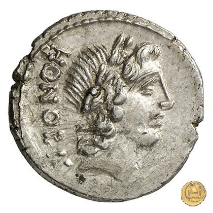 Testa laureata di Honos a destra. Sedia curule (con o senza corona di alloro) tra due spighe di grano.