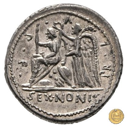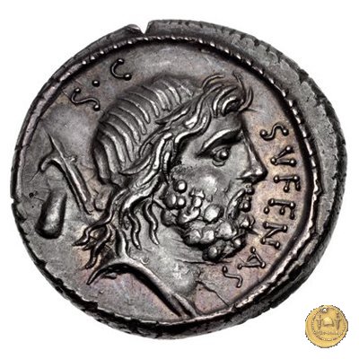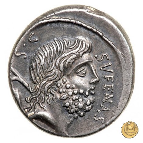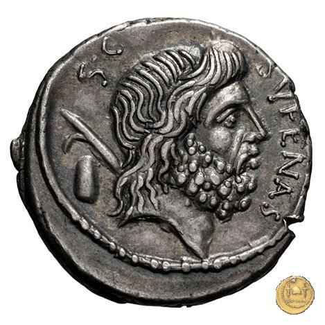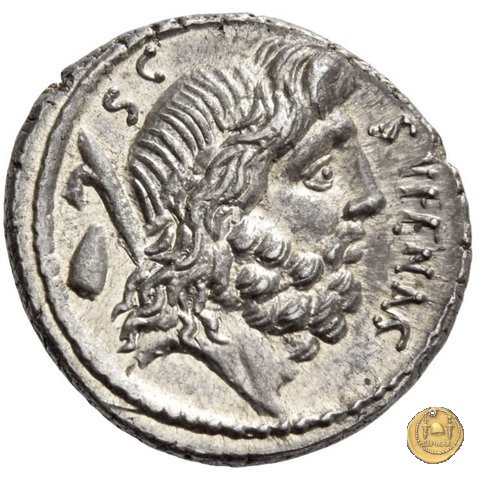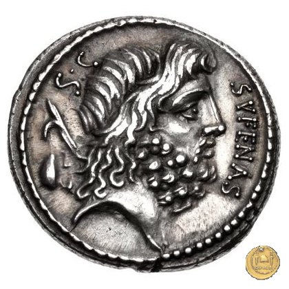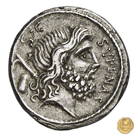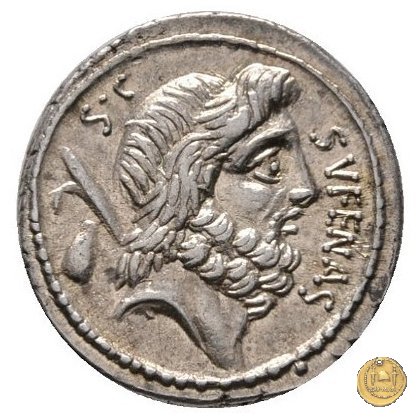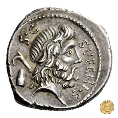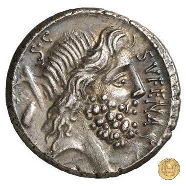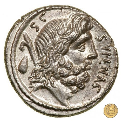 Testa di Saturno a destra, con l'harpa sulle spalle. Dietro un oggetto ovale.