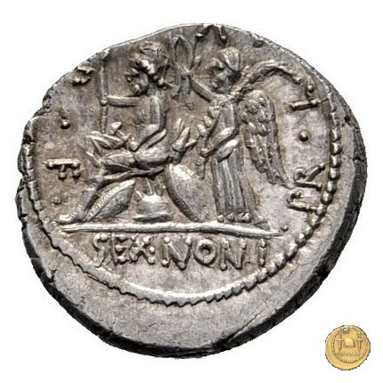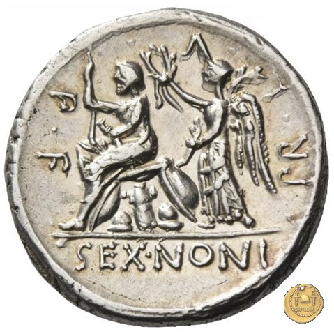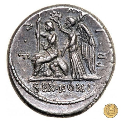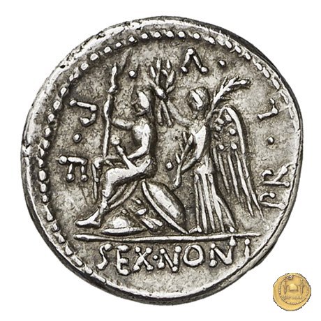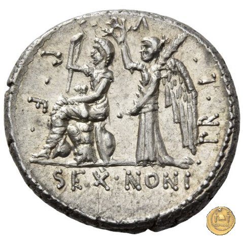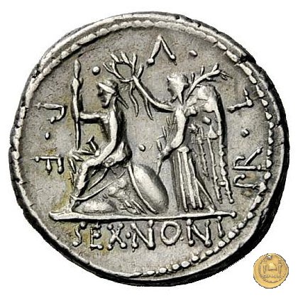 Roma, elmata e drappeggiata, seduta a sinistra su un cumulo di scudi; tiene lo scettro con la mano destra, il parazonium con la sinistra. Dietro la Vittoria che regge un ramo di palma con la mano sinistra e incorona Roma con la destra.