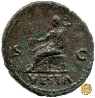 Vesta, drappeggiata, seduta su di una sedia dal basso schienale; nella mano destra una patera, nella sinistra un palladio.