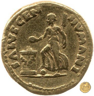Figura femminile, drappeggiata e rivolta verso sinistra, con il piede destro su di un globo; nella mano destra una patera, nella sinistra un timone; di fronte, un altare.
