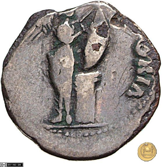 Una Vittoria, con il busto nudo e rivolto verso destra, intenta a scrivere su di uno scudo posato su di una colonna decorata da ghirlande.