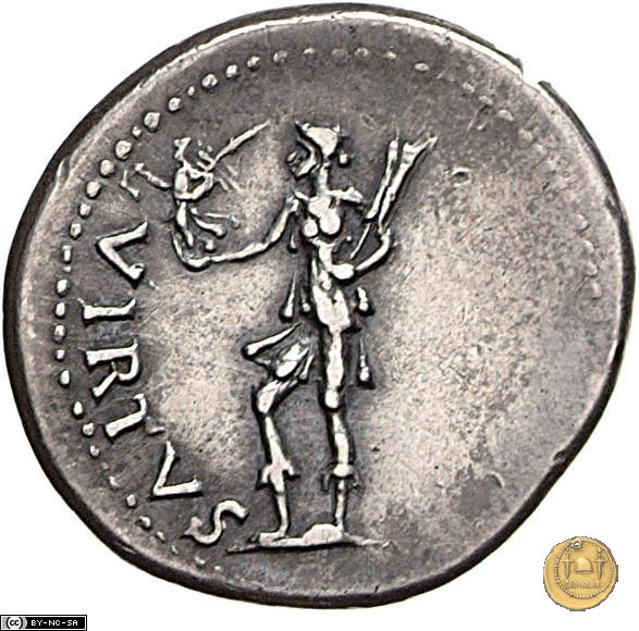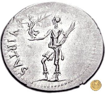 La Virtus, vestita di una tunica corta e corazzata, in piedi verso sinistra; nella mano destra una Vittoria su globo, nella sinistra un parazonium.