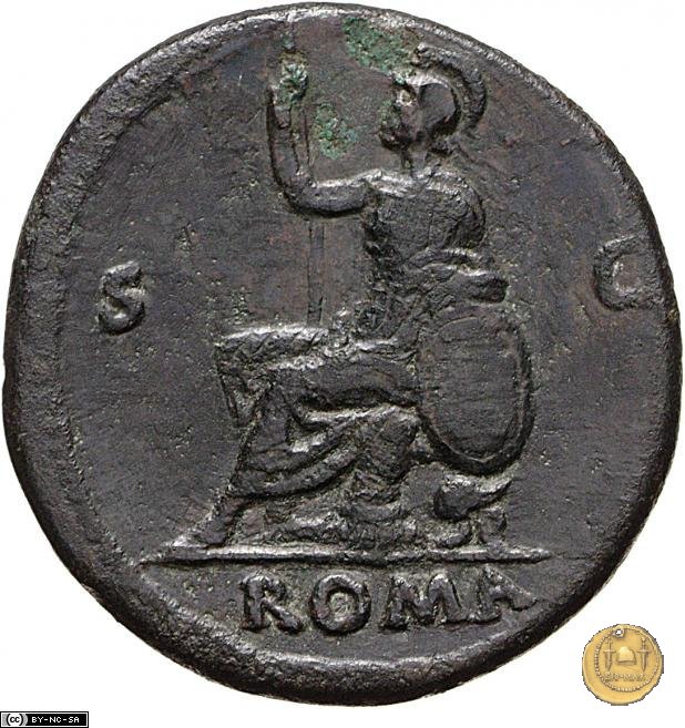 Roma, elmata, drappeggiata e seduta verso sinistra su di una corazza; nella mano destra una lancia, la sinistra, poggia su di uno scudo, che poggia a sua volta su di un elmo.