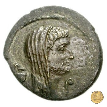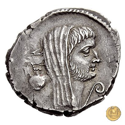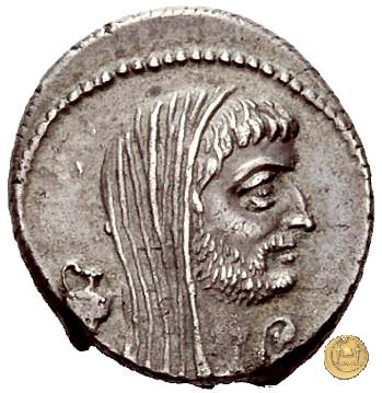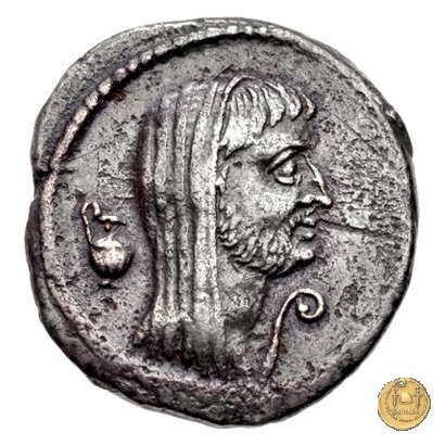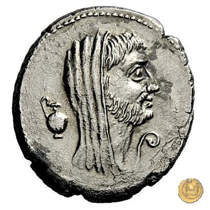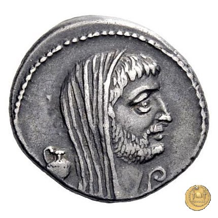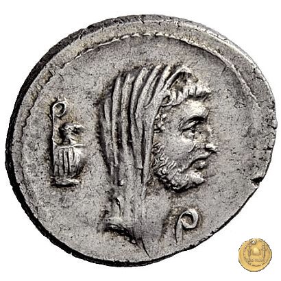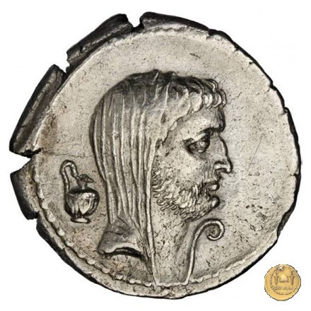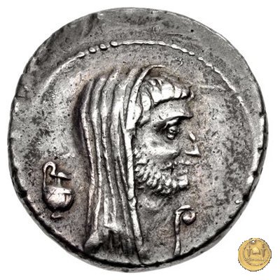 Testa barbata e velata di Marc'Antonio a destra. Davanti il lituus; dietro una brocca.