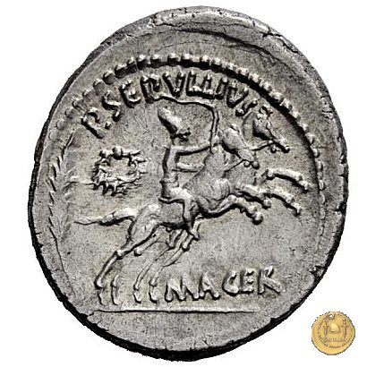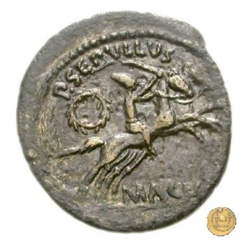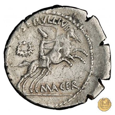 Desultor conduce due cavalli al galoppo verso destra; con berretto conico, tiene le redini con la mano sinistra, la frusta con la destra. Dietro un ramo di palma e una corona.