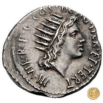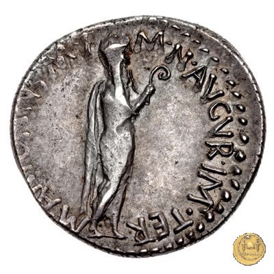 Marc'Antonio stante a destra, togato e velato; tiene il lituus con la mano destra. Testa del Sole a destra, con corona radiata.