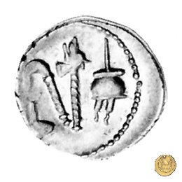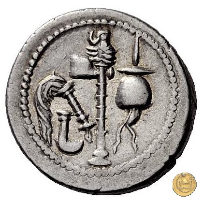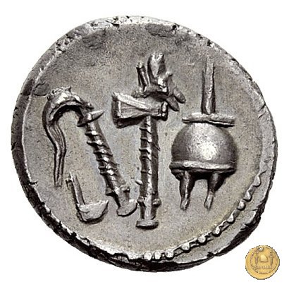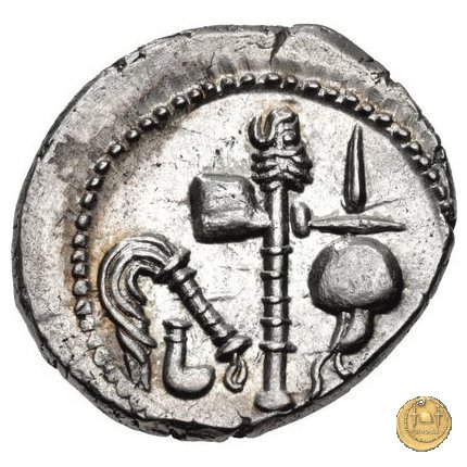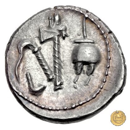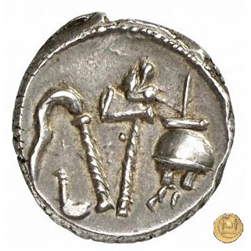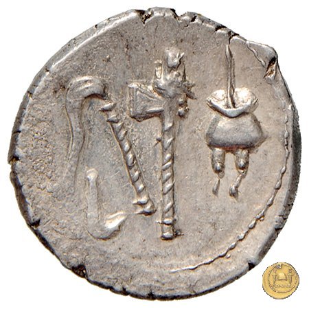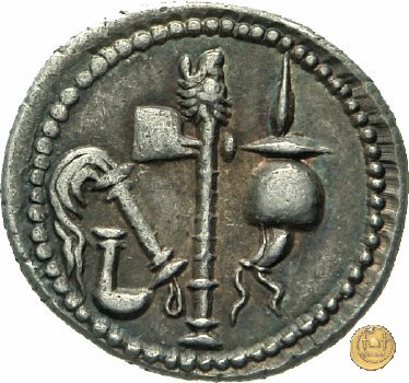 Culullus, aspergillum, ascia (securis) e apex. Elefante a destra calpesta un dragone (o un carnyx).