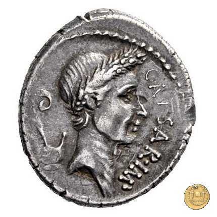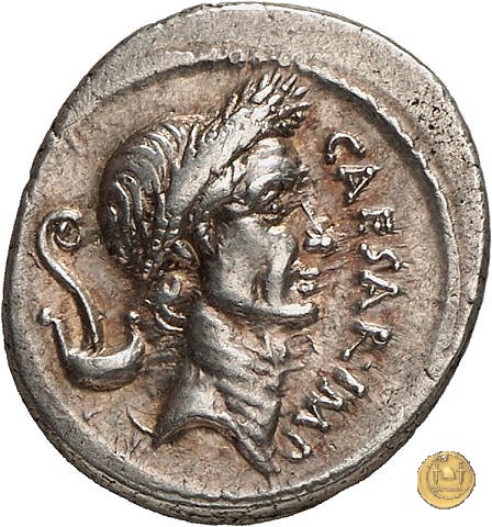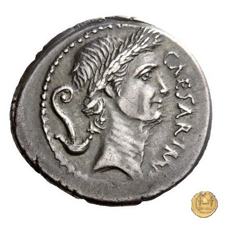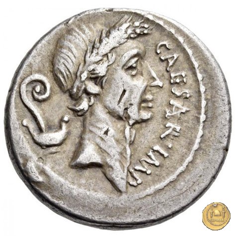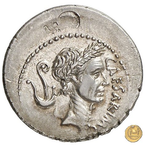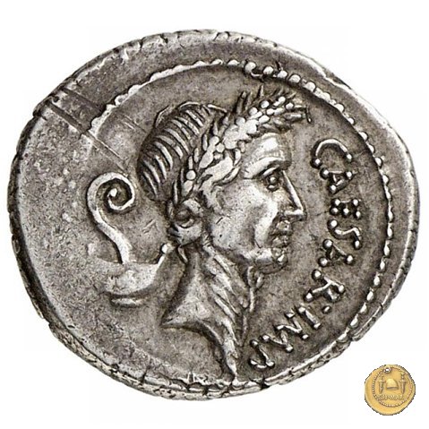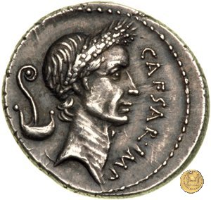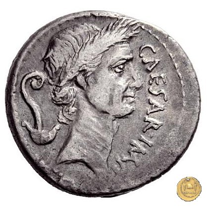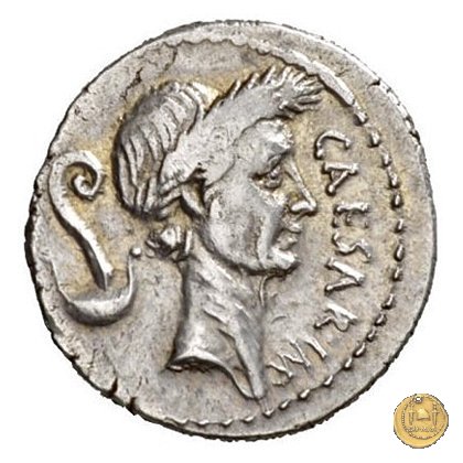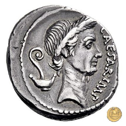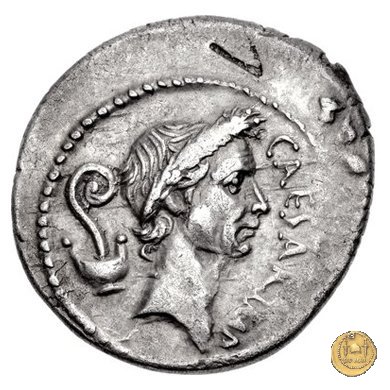 Testa laureata di Giulio Cesare a destra. Dietro il lituus e il culullus.