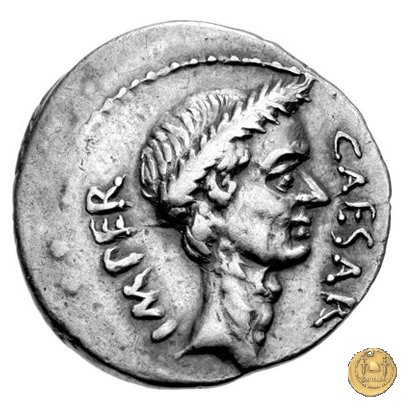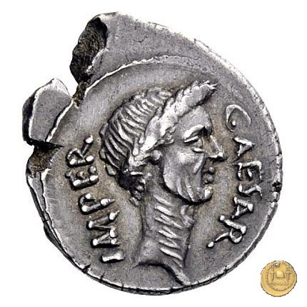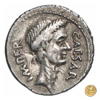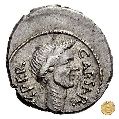 Testa laureata di Giulio Cesare a destra. Venere stante a sinistra; tiene la Vittoria con la mano destra, lo scettro con la sinistra e appoggia il gomito sinistro ad uno scudo collocato sul globo. Davanti una lettera di controllo.