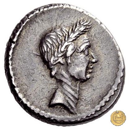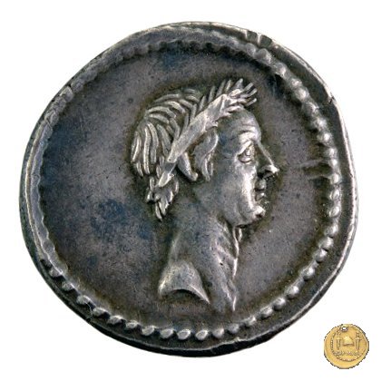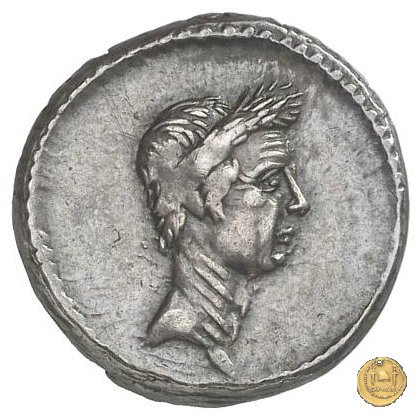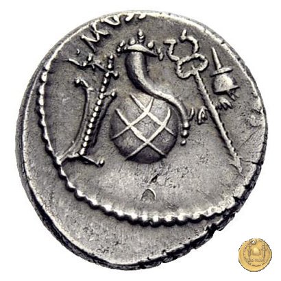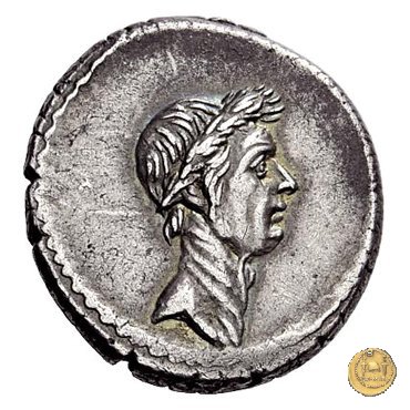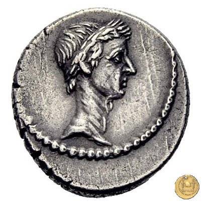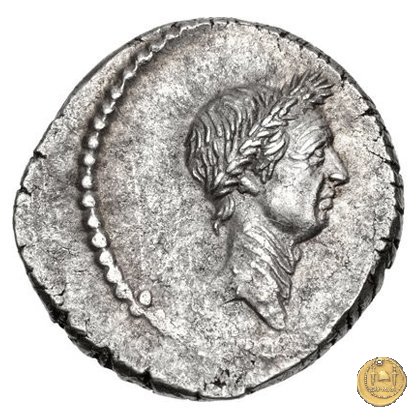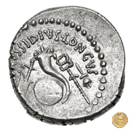 Testa laureata di Giulio Cesare a destra. Cornucopia su globo. A sinistra un timone; a destra un caduceo e un apex.