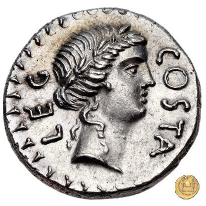 Testa laureata di Apollo a destra. Trofeo d'armi con elmo, corazza, scudo oblungo e due lance.