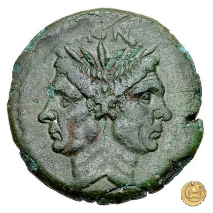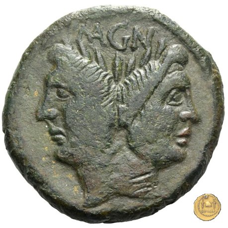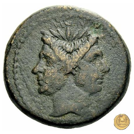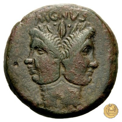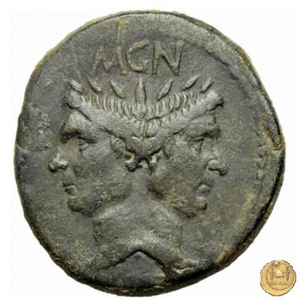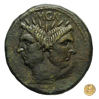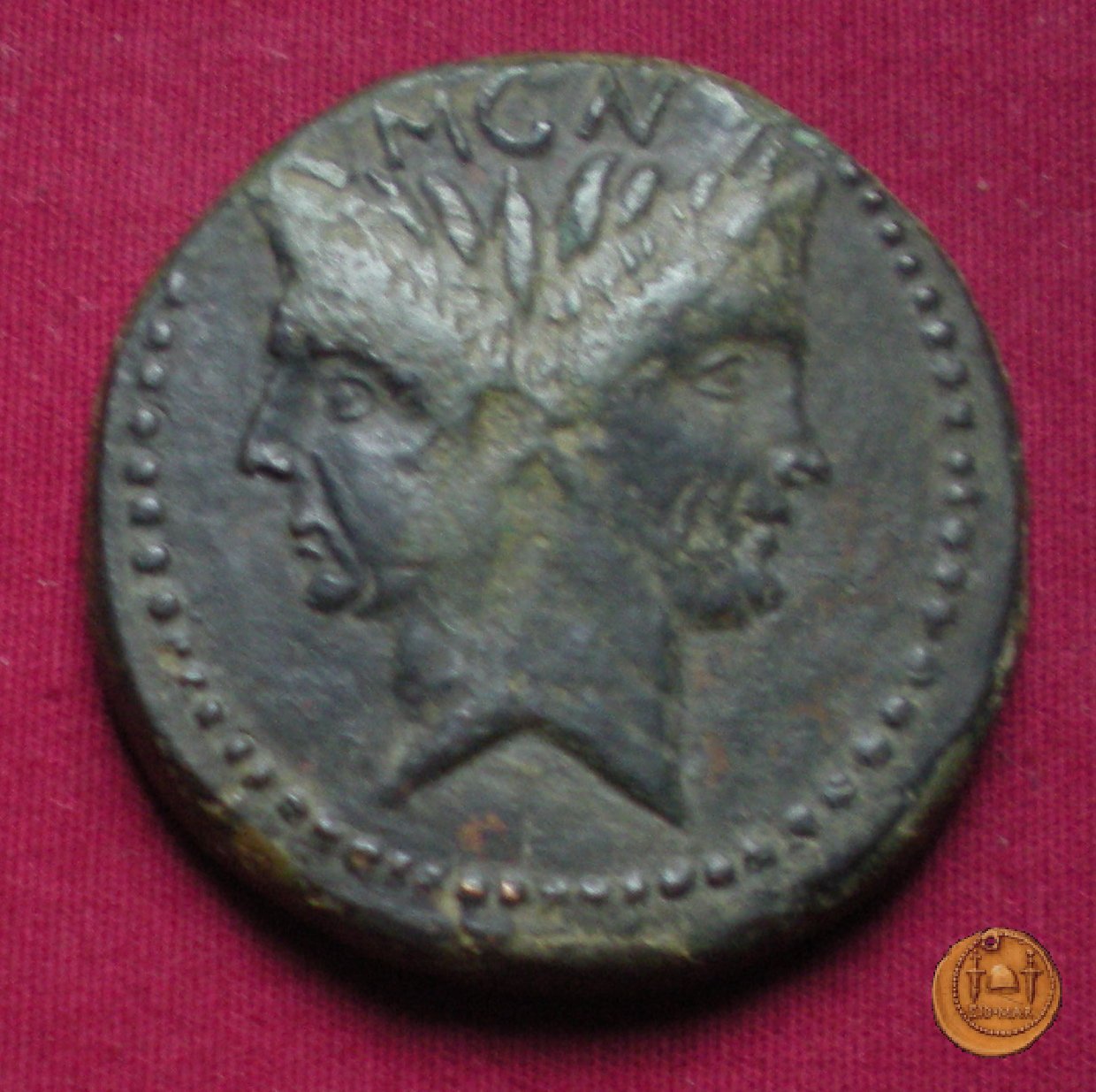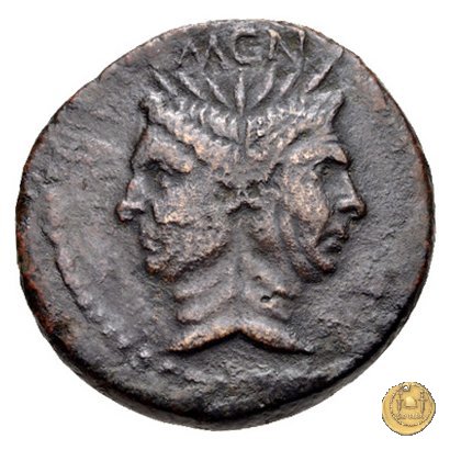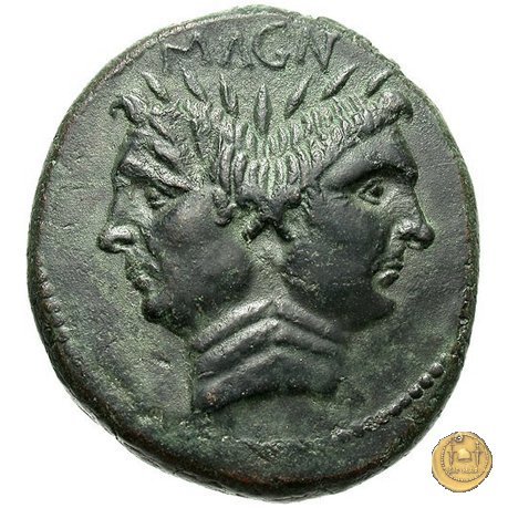 Testa laureata di Giano, con le sembianze di Cn. Pompeo Magno. In alto: MA GNVS oppure MA GNV oppure MA GN oppure MGN