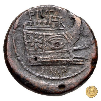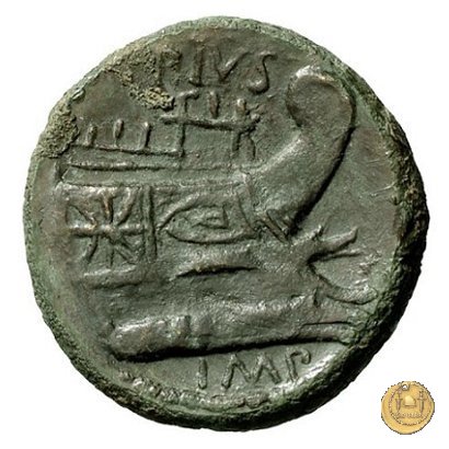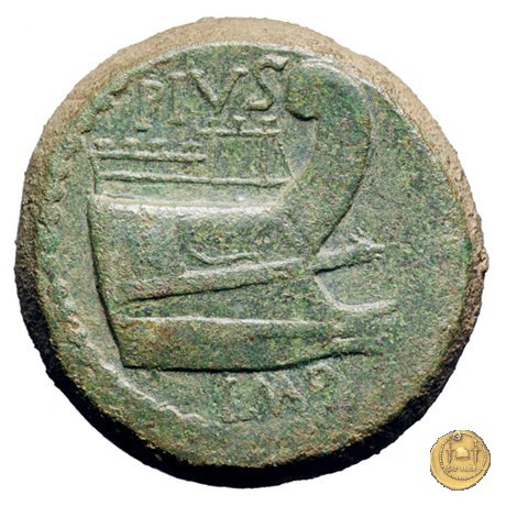 Prora di nave a destra, ornata con stella ed oculo apotropaico. In alto: PIVS ; in basso: IMP