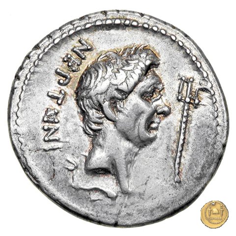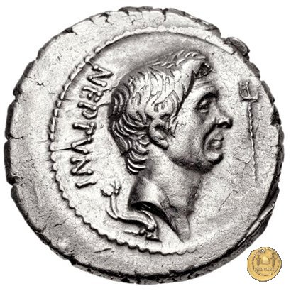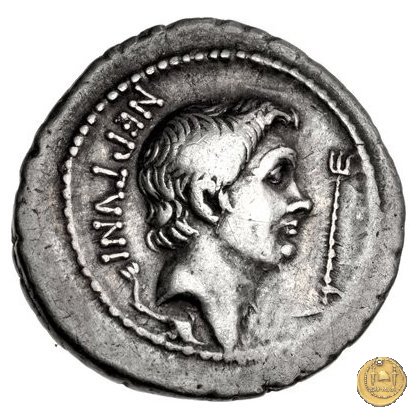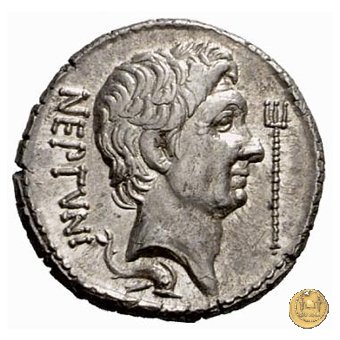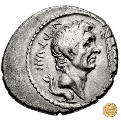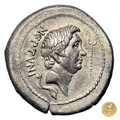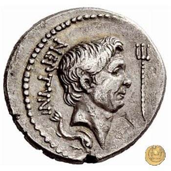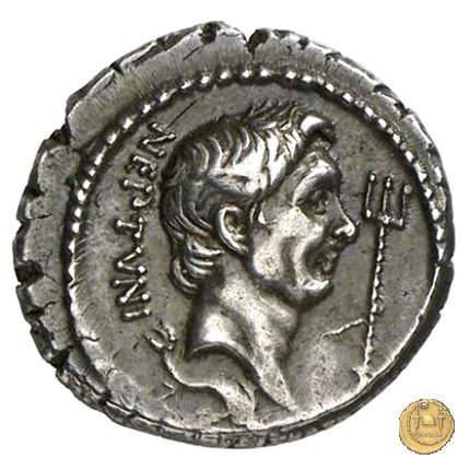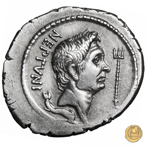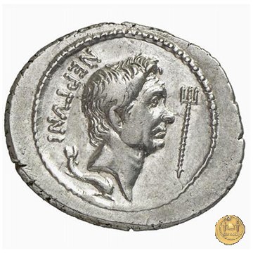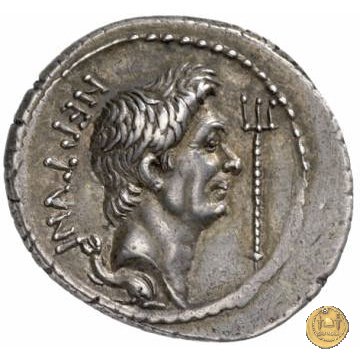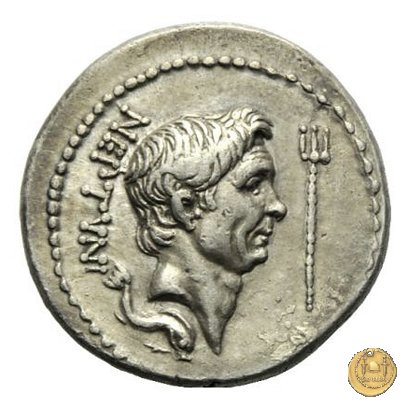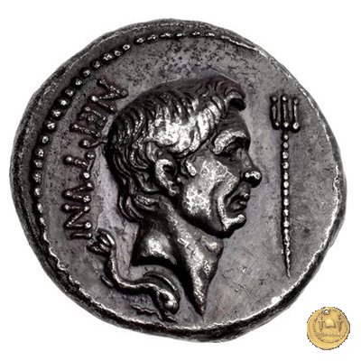 Testa di Pompeo Magno a destra. Davanti un tridente; in basso un delfino. Galera in navigazione verso destra. In alto una stella.