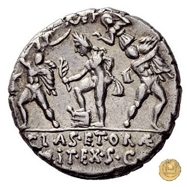 Testa di Pompeo Magno a destra. Dietro una brocca; davanti il lituus. Nettuno, al centro, stante a sinistra, con diadema; tiene un mantello sul braccio sinistro e un aplustre con la mano destra; poggia il piede destro su una prua. Ai lati i due fratelli Anapias e Amphinomus che trasportano sulle spalle i propri genitori.