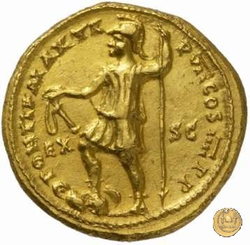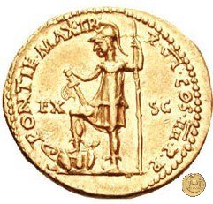 La Virtus, elmata e in abbigliamento militare rivolta verso sinistra; il piede destro su di un pila di armi; tiene con la mano destra il parazonium sul ginocchio e con la sinistra una lancia.
