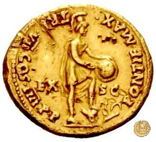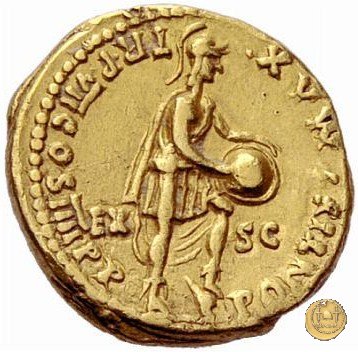 Roma, elmata in abbigliamento militare, rivolta verso destra; il piede sinistro su di un elmo. Iscrive su di uno scudo tenuto dalla mano sinistra sul ginocchio.