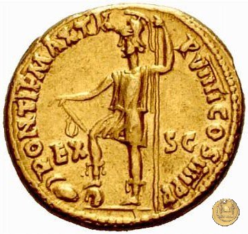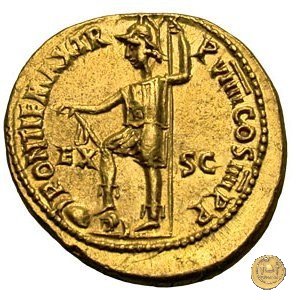 Testa di Nerone rivolta verso destra. La Virtus, elmata e in abbigliamento militare rivolta verso sinistra; il piede destro su di un pila di armi; tiene con la mano destra il parazonium sul ginocchio e con la sinistra una lancia.
