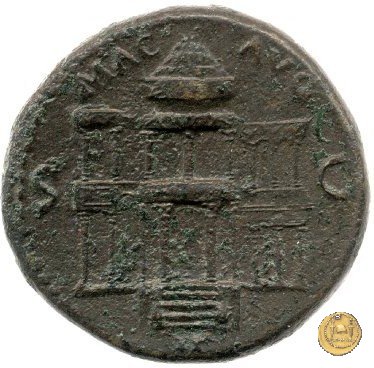 Visuale frontale del Macellum Magnum; la parte centrale, su due piani, nella quale si entra tramite dei gradini è affiancata da due ale di differenti altezze, porticate. In cima alla scalinata, una figura in piedi verso sinistra e con in mano uno scettro.