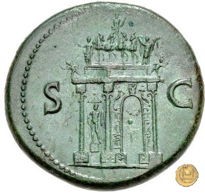 Testa di Nerone laureata rivolta verso destra. Globo all'apice del busto. Arco di trionfo addobbato con ghirlande, di fronte e lateralmente. Sopra di esso, l'Imperatore su di una quadriga, verso destra, scortato da una Vittoria, che tiene una ghirlanda e una palma e dalla Pax, con in mano un caduceo e una cornucopia. Sotto la quadriga, all'estrema sinistra e destra, due soldati di piccole dimensioni. Alla sinistra dell'arco, in una nicchia, Marte, con una lancia e uno scudo. Rilievi alla base dei plinti dell'arco.