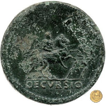 Nerone che galoppa verso destra, corazzato e con il mantello che sventola. Davanti a lui un soldato a piedi che procede verso destra e con la testa rivolta indietro, con in mano un vessillo. Dietro di lui, un altro soldato, elmato, che corre verso destra.