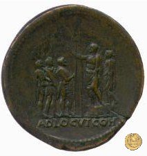 Nerone, togato e rivolto verso sinistra, con un prefetto del pretorio, anch'esso togato, su di una piattaforma sulla destra; la mano destra è rivolta a 3 soldati, in piedi verso destra, disposti su una fila e dei quali i primi due, tengono due stendardi. Nello sfondo, una struttura a semiluna.