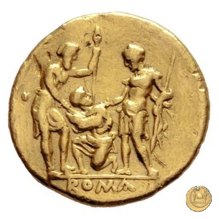 Il Crawford ha distinto questa emisione aurea in due gruppi di coni: il primo, coniato a Roma (28/1), è caratterizzato dalla notevole somiglianza con le emissioni dei quadrigati a leggenda incusa; l'altro gruppo (29/1), prodotto in una zecca ausiliaria sconosciuta, mostra invece uno stile simile ai quadrigati caratterizzati dalla tavoletta a forma di trapezio rovesciato. |