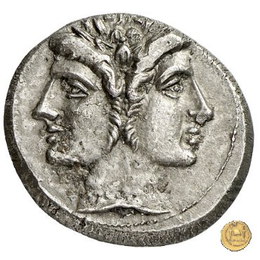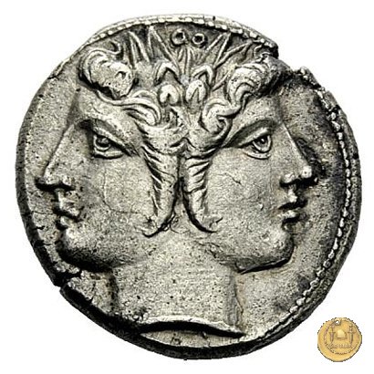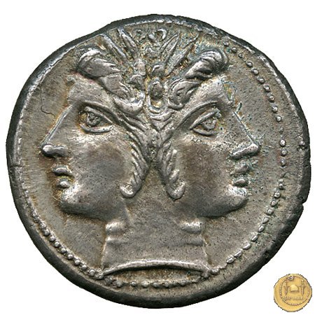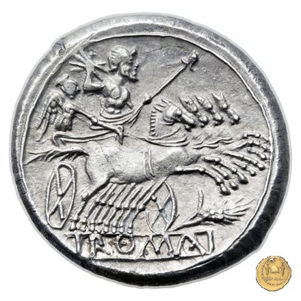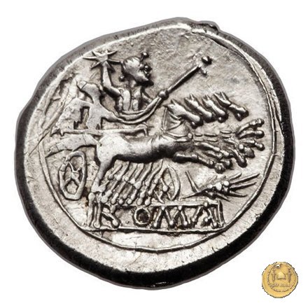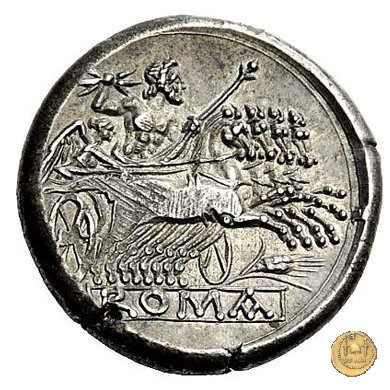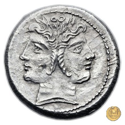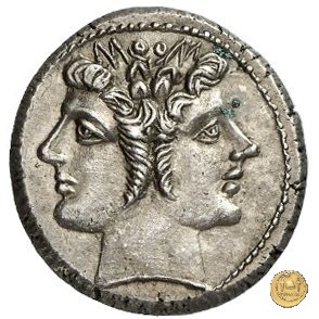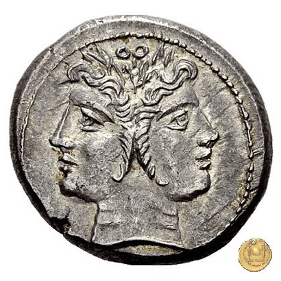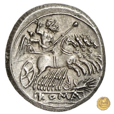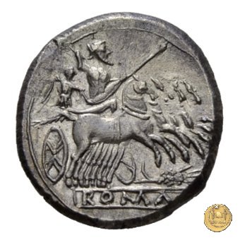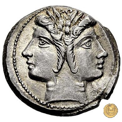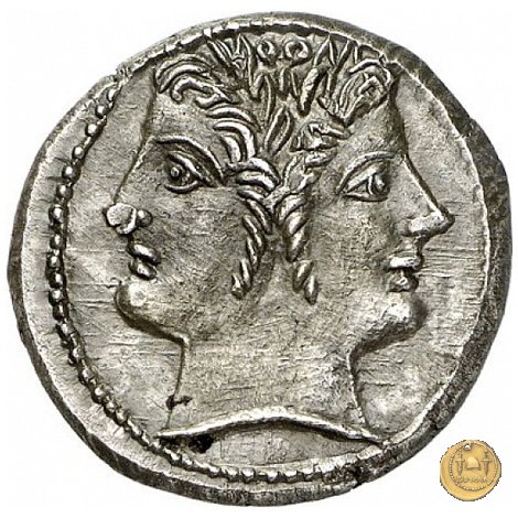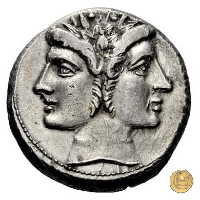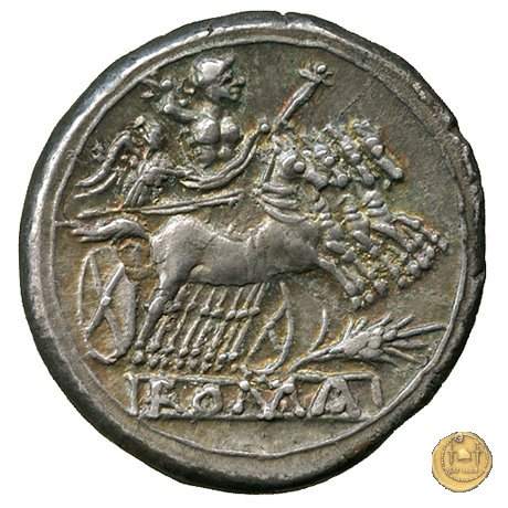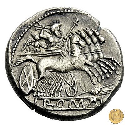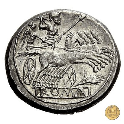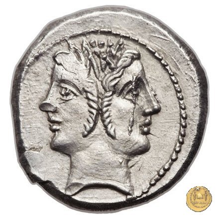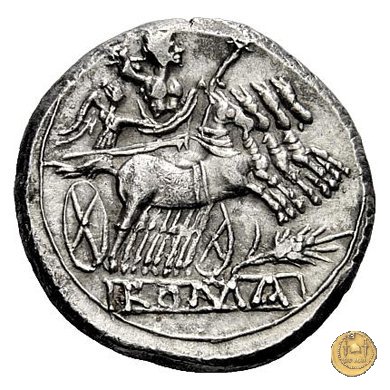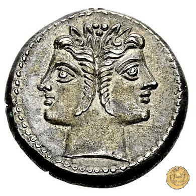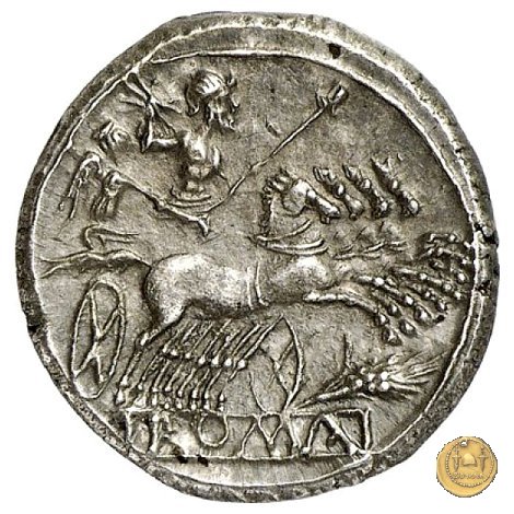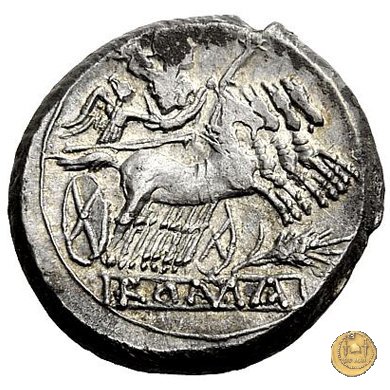 Testa laureata gianiforme dei Dioscuri. Giove su quadriga verso destra; tiene lo scettro con la mano sinistra e sta per scagliare il fulmine con la destra. Dietro la Vittoria con le redini. Sotto una spiga di grano.