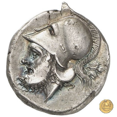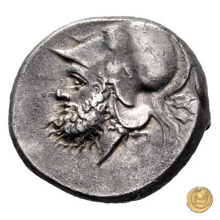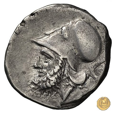 Testa di Marte barbato a sinistra, con elmo corinzio. Dietro un rametto di quercia con ghianda.