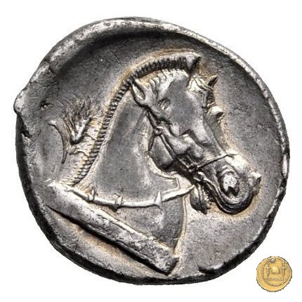 Protome equina a destra, imbrigliata. Dietro una spiga di grano.