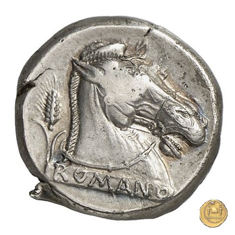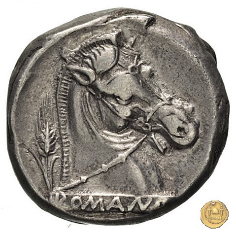 Per la presenza della spiga di grano, il Crawford ha attribuito la moneta, con forma dubitativa, alla zecca di Metaponto (che coniava monete con quel simbolo). Per altri autori sarebbe invece piú probabile una zecca campana, considerati i vincoli che in quel periodo legavano Roma alla Campania. |