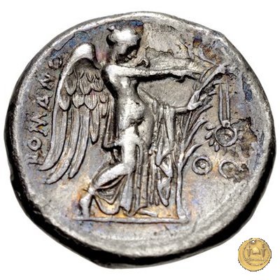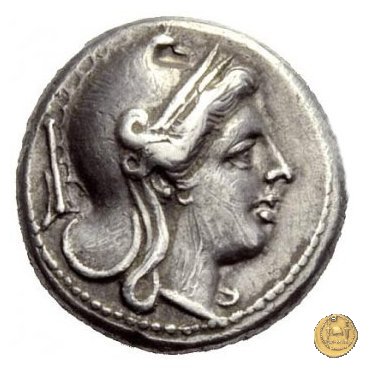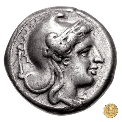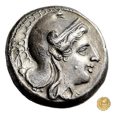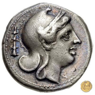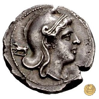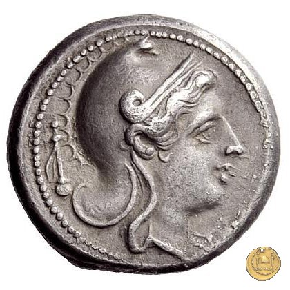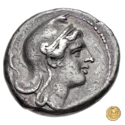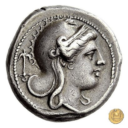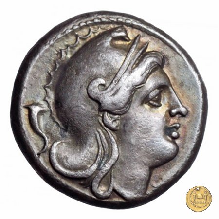Testa di Roma a destra, con elmo frigio con testa di grifone. Dietro un simbolo di controllo.