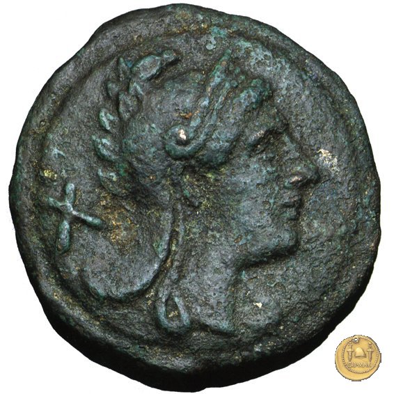 Testa di Roma a destra, con elmo frigio. Dietro: X