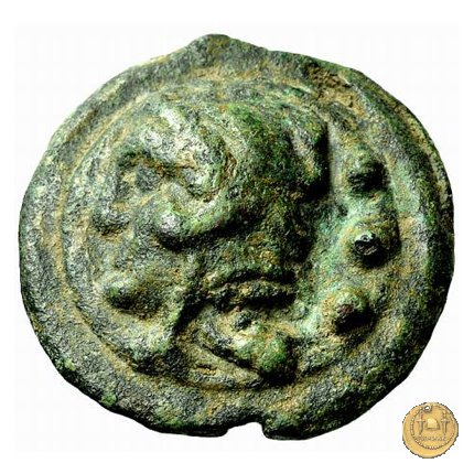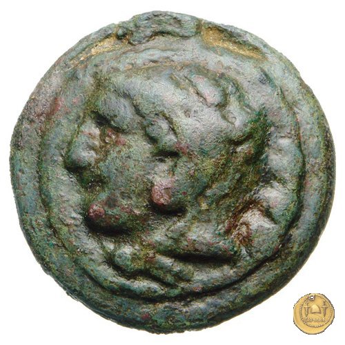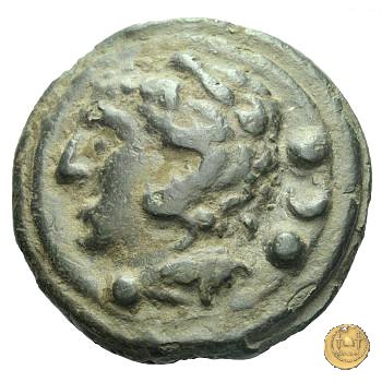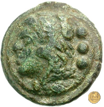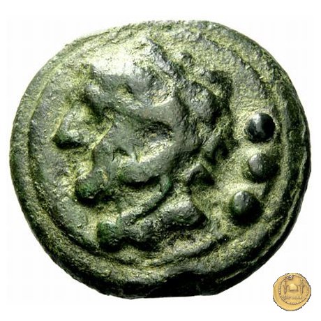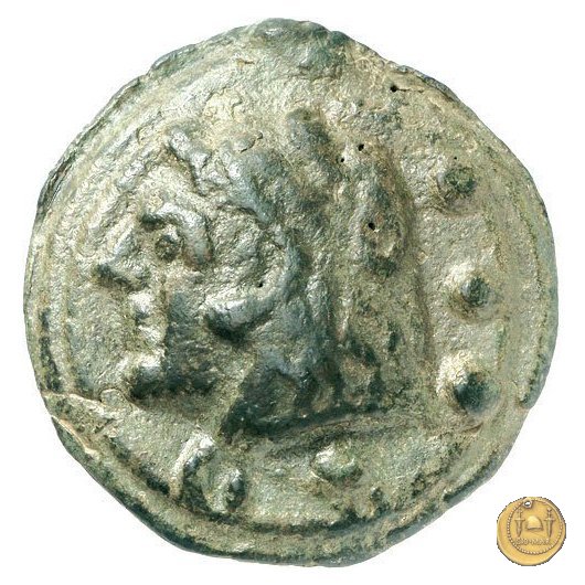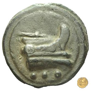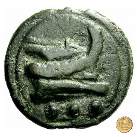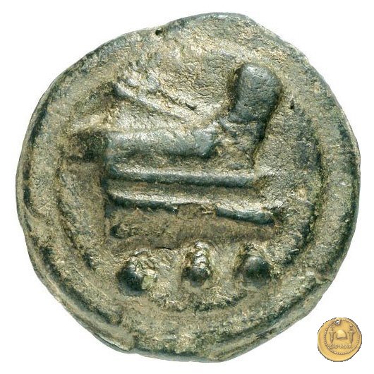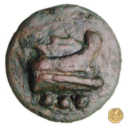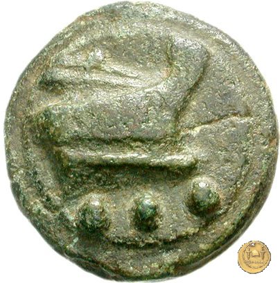 Testa di Ercole a sinistra, con il capo avvolto nella pelle leonina. Dietro tre globetti. Prora di nave a destra. In basso tre globetti.