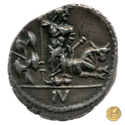 Guerriero stante di fronte, con la testa elmata volta a destra; vestito di corazza e mantello, tiene nella mano destra la lancia con la punta rivolta in basso e poggia il piede sinistro sul corpo disteso della lupa romana (? o calpesta uno stendardo romano). A destra una protome di toro accovacciato. A sinistra un albero al quale sono appesi quattro scudi. In esergo un numero di controllo.