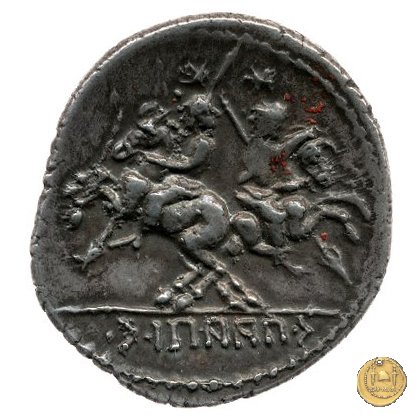 Testa femminile (l'Italia) a destra, con elmo attico alato, crestato e sormontato da una testa di grifo. Dietro una corona d'alloro. In basso: * ITALIA I Dioscuri su cavalli impennati in direzioni opposte; volgono il capo l'uno verso l'altro e tengono le lance abbassate; in alto due stelle. In esergo: C. PAAPI. C. (in osco e retrogrado)