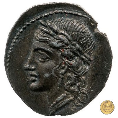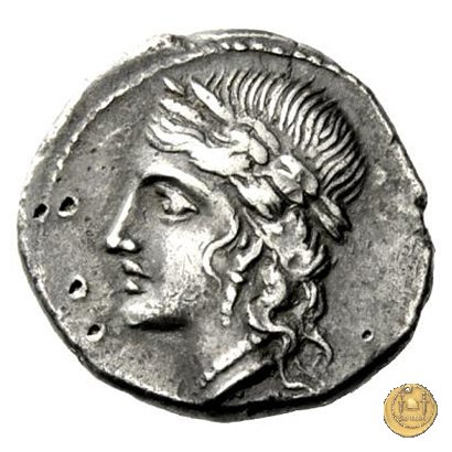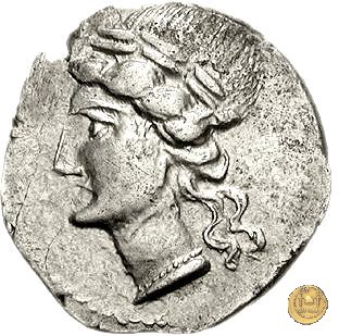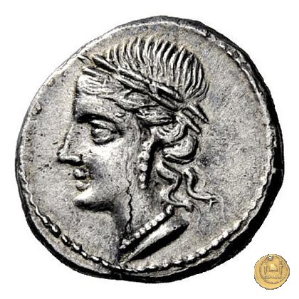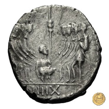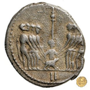 Testa laureata dell'Italia a sinistra, con collana ed orecchino a un pendente. Otto guerrieri, quattro per parte, prestano giuramento con le spade puntate verso un maialino tenuto in braccio dal sacerdos faecialis, in ginocchio. Dietro un palo con vessillo. In esergo un numero di controllo.