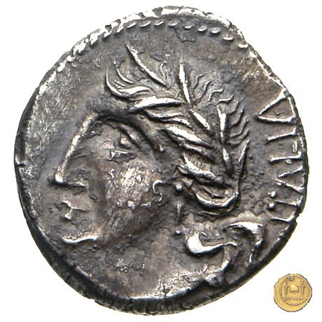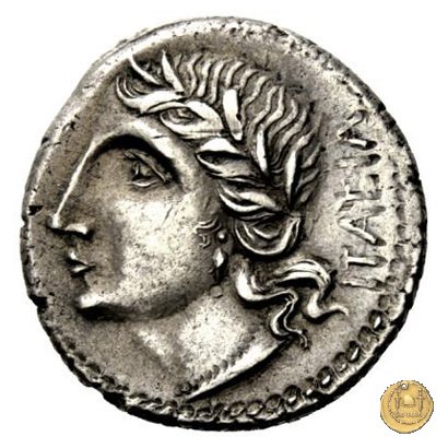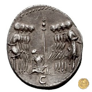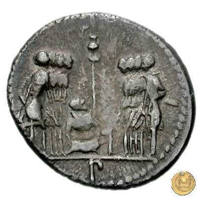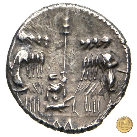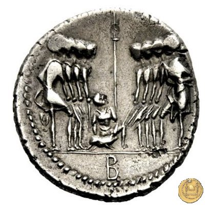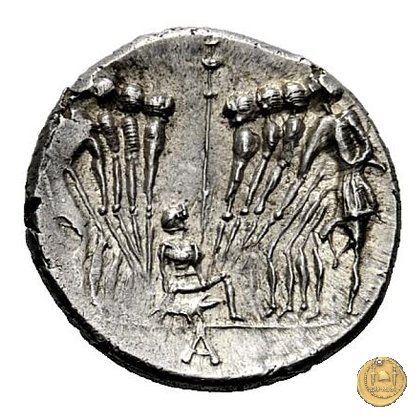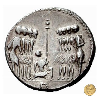 Otto guerrieri, quattro per parte, prestano giuramento con le spade puntate verso un maialino tenuto in braccio dal sacerdos faecialis, in ginocchio. Dietro un palo con vessillo. In esergo una lettera di controllo.