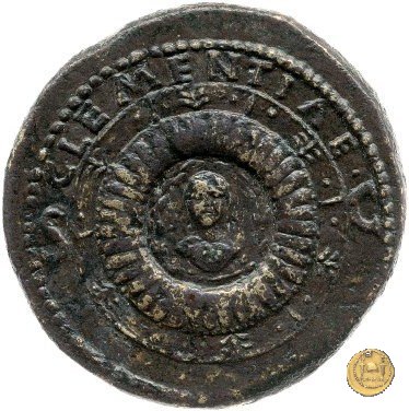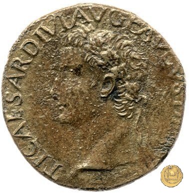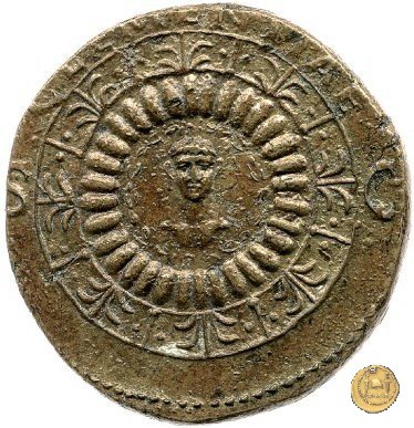 Piccolo busto di Tiberio (?), laureato e drappeggiato, circondato da una corona d'alloro, a sua volta circondata da una ghirlanda di petali, sormontata da palmette e punti.