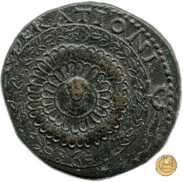Piccolo busto di Tiberio (?), circondato da una corona di petali, contornata a sua volta da un motivo floreale e punti.