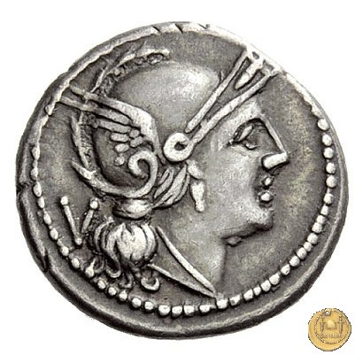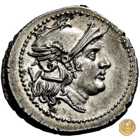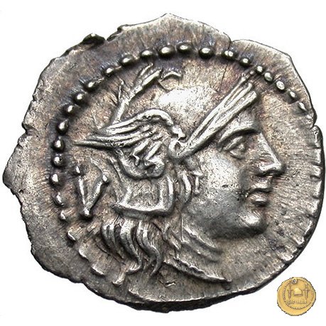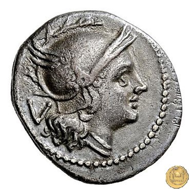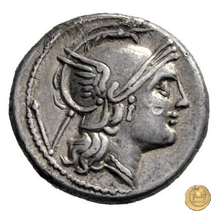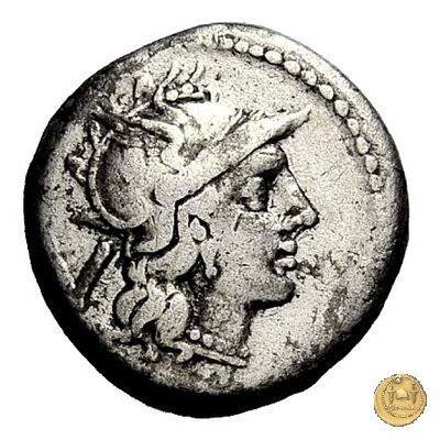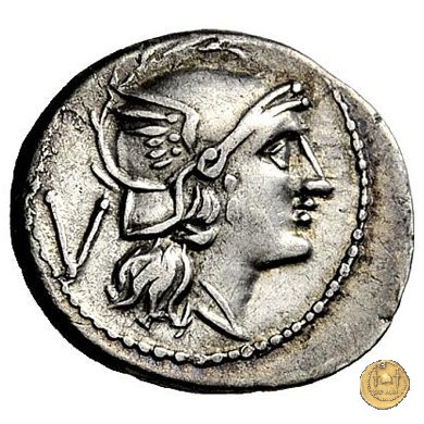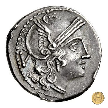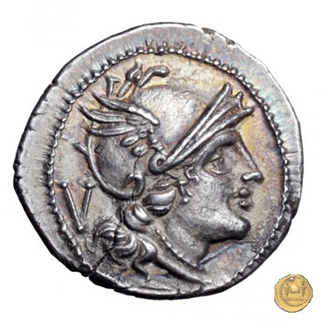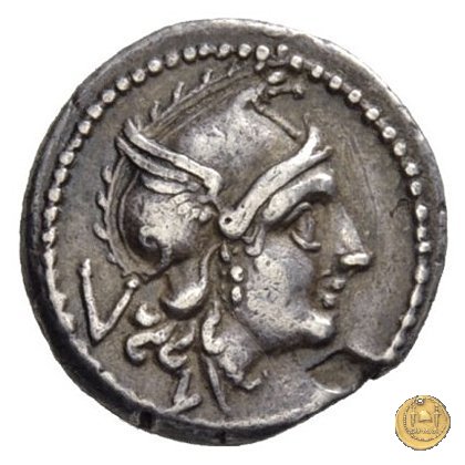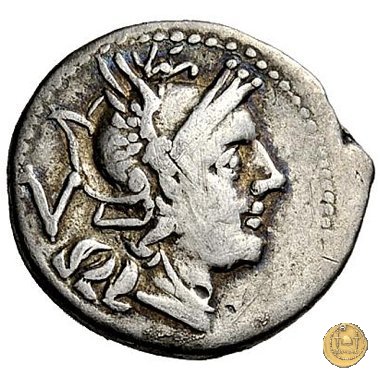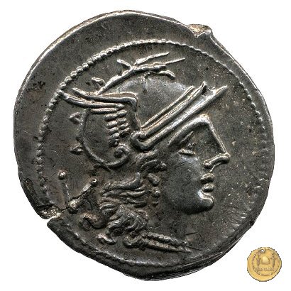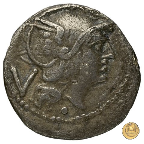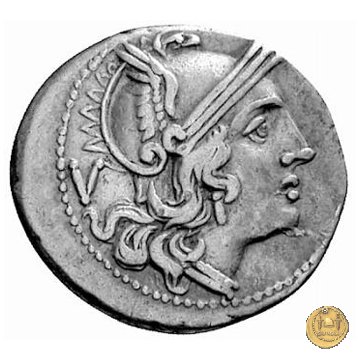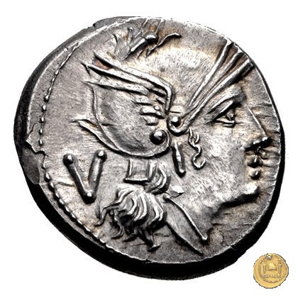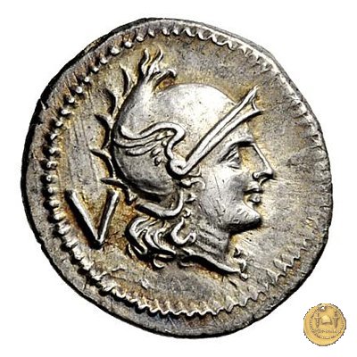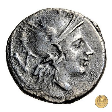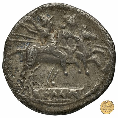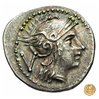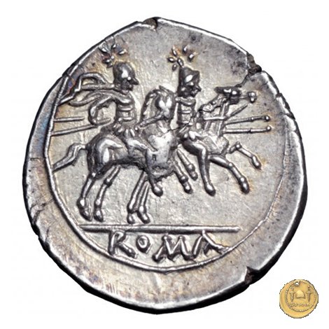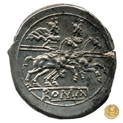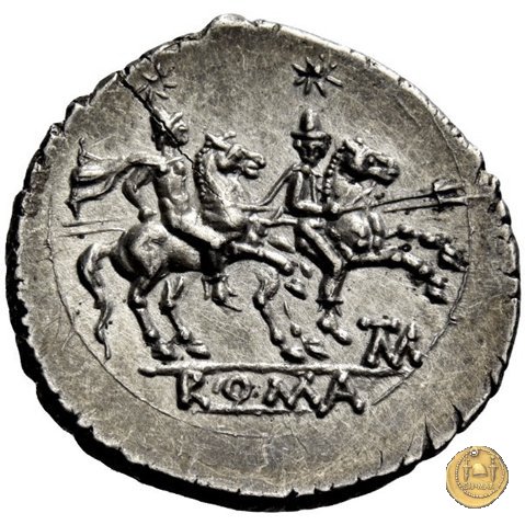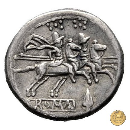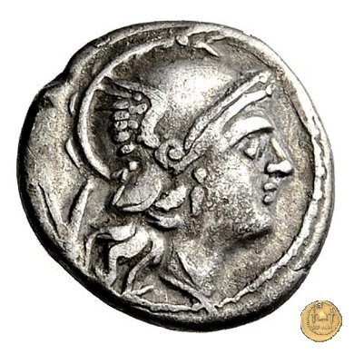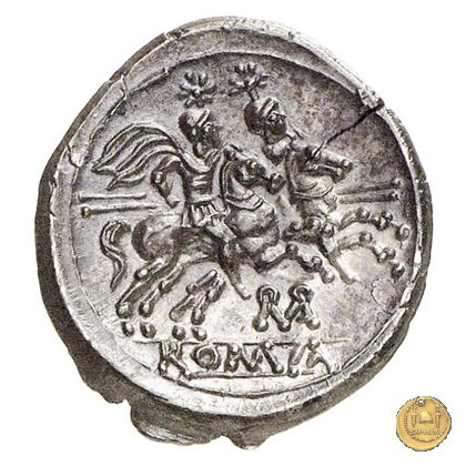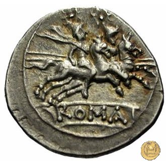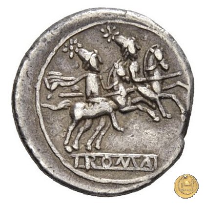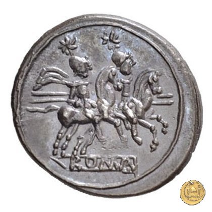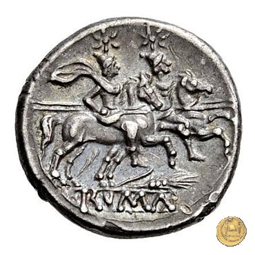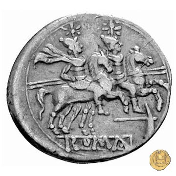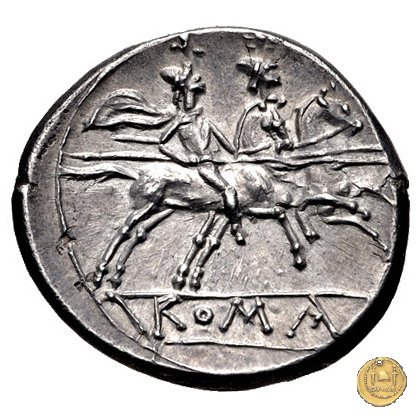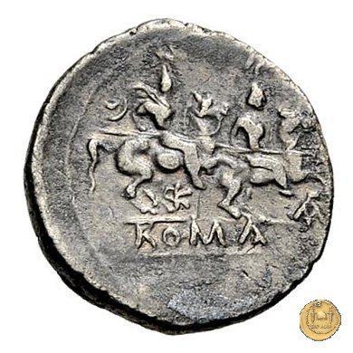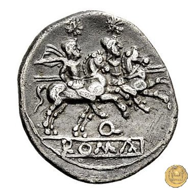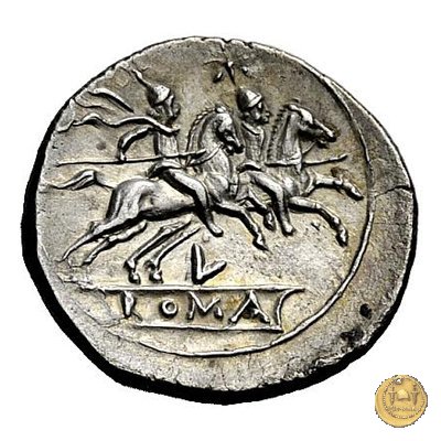 72/4 - spiga di grano (corn-ear) Obverse: Testa di Roma a destra, con elmo attico alato. Dietro: V Reverse: ROMA I Dioscuri a cavallo verso destra, con lancia in resta; due stelle sopra i loro pilei. Sotto una spiga di grano. | |