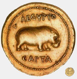 CLM670 Obverse: ![]() IMP CAESAR DIVI F ![]() AVGVST COS VIITesta di Augusto rivolta verso destra. Sotto il collo, un capricorno rivolto anch'esso verso destra. Reverse: → AEGYPTO / CAPTA Un ippopotamo rivolto verso destra. |