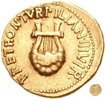CLM106 Dritto: ![]() TVRPILIANVS ![]() IIIVIRTesta di Libero, incoronata d'edera, rivolta verso destra. Verso: → AVGVSTO / OB C S Una ghirlanda di quercia che circonda la legenda. | |
